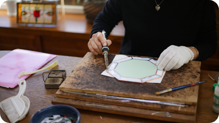 板ガラスを図案に合わせてカットし、金属(ハンダ)でつなぎながら絵や模様を構築します。キャンドルスタンドやランプシェード等、暮らしの中で使える作品制作を行います。